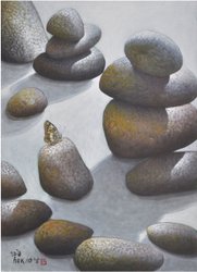 3. 남학호 화가는 조약돌 작가로 불립니다. 삶의 집합체인 조약돌들에는 인생사 같은 과정이 고스란히 담겨 있고 각각의 모양에는 아름다운 추억, 못 다한 사랑, 사무치는 그리움, 불멸의 생명을 소망하는 희망들이 기록되어 있습니다. 장생(長生)을 기원하는 인간들의 욕망을 돌(石)과 나비(蝶)를 통해 형상화하고 주술적 사유를 더하여 우주의 역사를 기록한 것이 돌 그림입니다.
