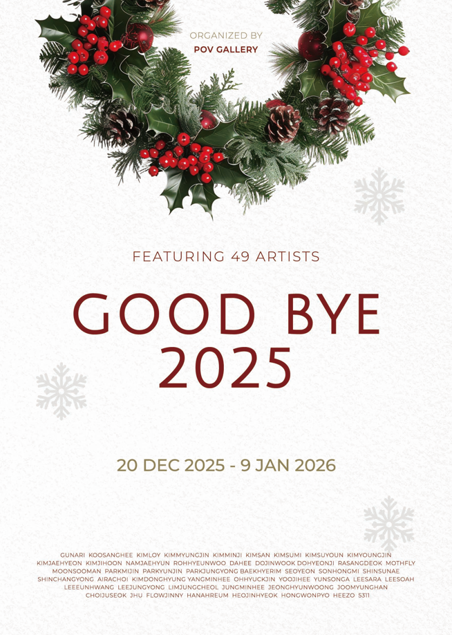 POV GALLERY의 연말 기획전 <GOOD BYE 2025>는, 한 해를 끝낸다기보다 우리가 지나온 시간에 이름을 붙여 주는 전시가 되길 바라는 마음에서 시작되었습니다. 올해를 통과해 온 수많은 시선들을 한자리에 모아, 누군가에게는 선물처럼 또 누군가에게는 정리처럼 조용히 닿기를 바랍니다.