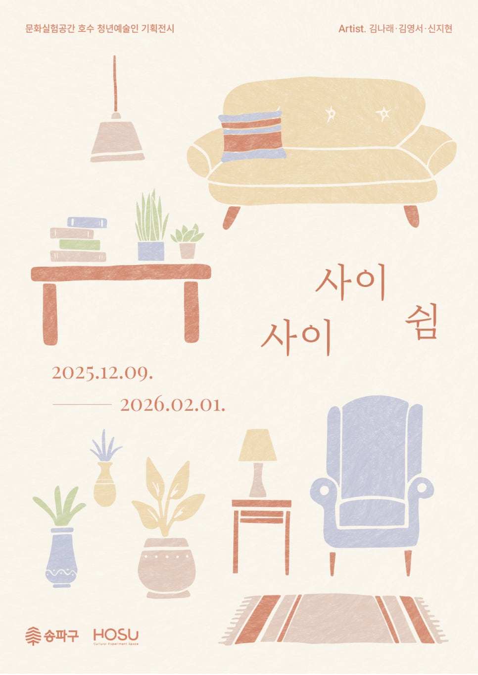 이번 전시는 문화실험공간 호수에서 준비한 2025년의 마지막 전시인 <사이 사이 쉼>展입니다. 2025년 한 해 동안 쌓아 온 일상을 되돌아보고 스스로 고생해 또다시 여기까지 왔음을 인정하고 다독이며 바뀌는 한 해를 맞이할 준비를 하는 동안, 그사이에 잠시 쉬어갈 순간이 되길 바라는 마음으로 편안함을 가져다주는 작품을 모아 전시를 준비하였습니다. 김나래, 김영서, 신지현 작가가 전해주는 따스한 이야기를 들으며 잠시 멈춰 재충전할 수 있는 때가 되길 바랍니다.